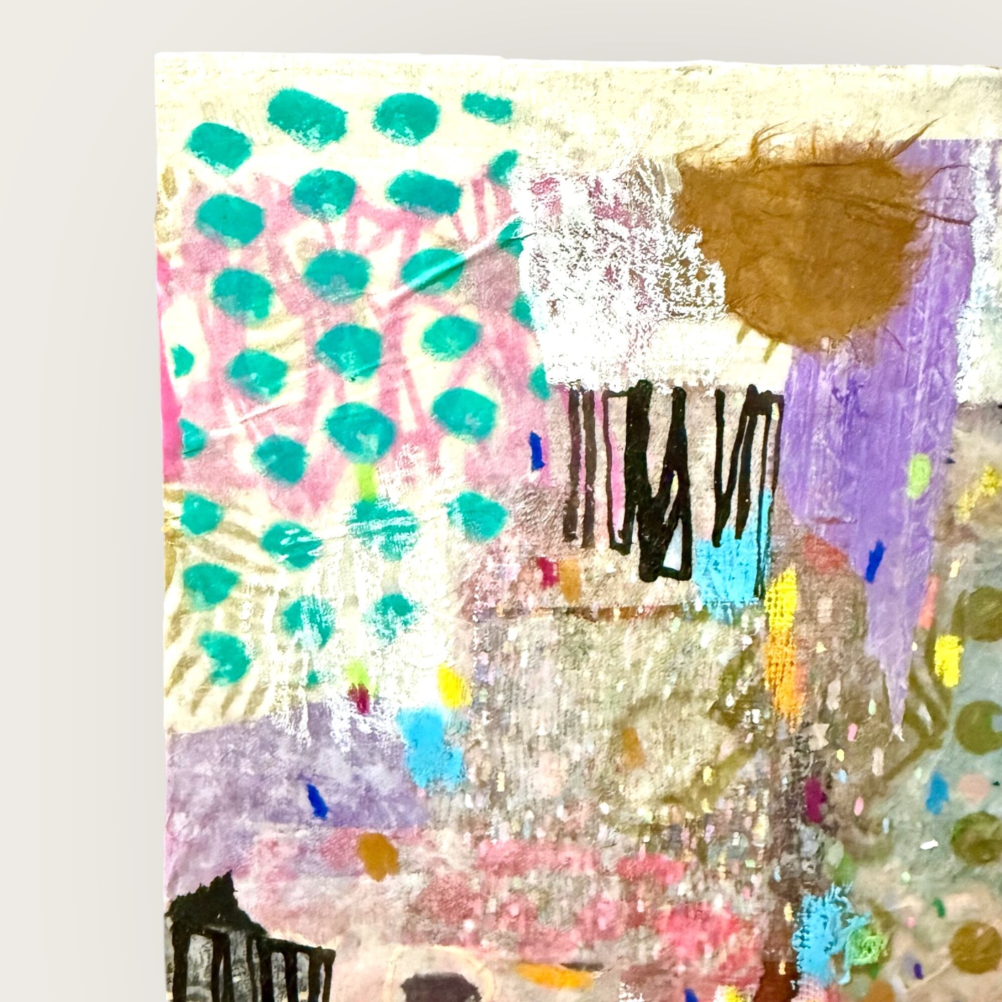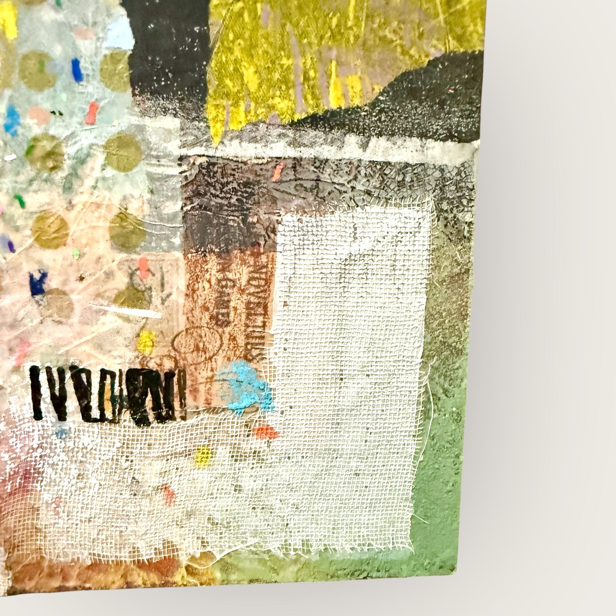鮮やかな黄色やパステルカラーが調和し、抽象的な形態とドット模様、線のテクスチャが自由に共存する構成となっています。右上のひび割れ模様や中央のゴールドの円形パーツが、視線を引き寄せるアクセントとなっており、全体に漂う柔らかな雰囲気とともに、バランスと調和(ハルモニア)のテーマを感じさせます。